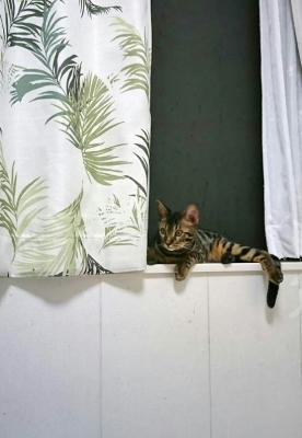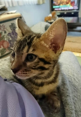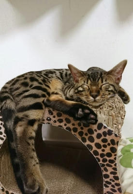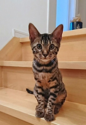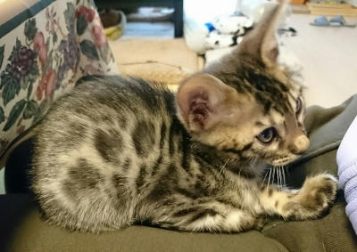 この猫種特有の豹柄はまだ薄い。