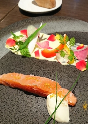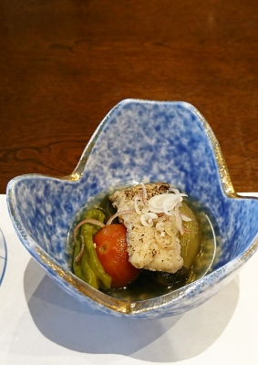 信州サーモンのミキュイ 夏野菜をオレンジのソースで。