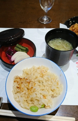 一人用の釜で炊いた釜飯は桜エビと枝豆。