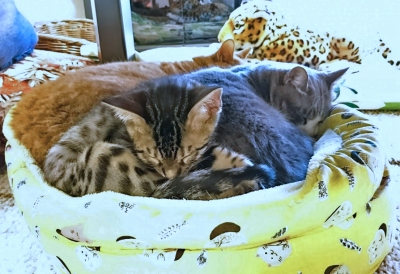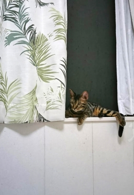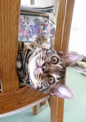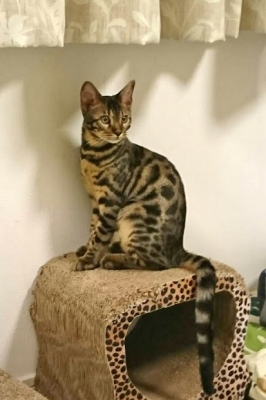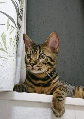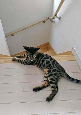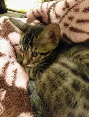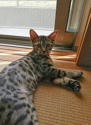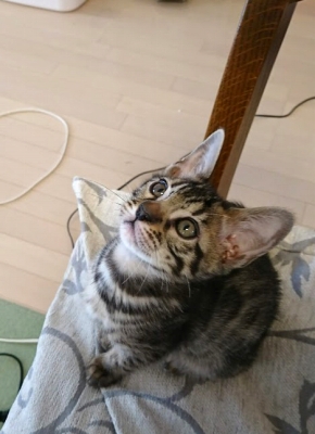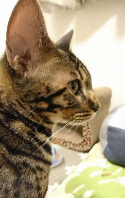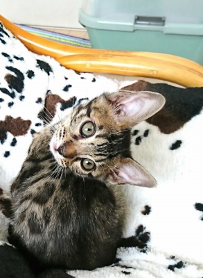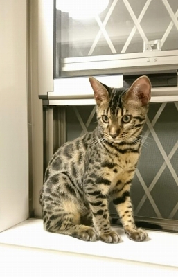 この猫種特有の豹柄はまだ薄い。